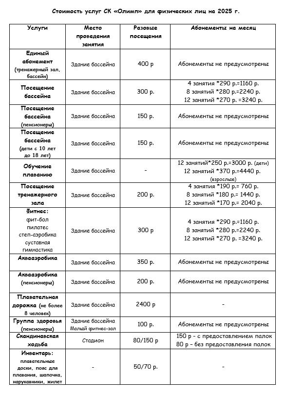 Спортивный комплекс «Олимп» - современный спортивно-оздоровительный центр, предлагающий посетителям широкий спектр услуг и использующий в работе гибкую систему обслуживания социальной направленности. Здесь представлено большое разнообразие спортивных направлений и секций, которые можно подобрать на любой вкус, как для детей, так и для взрослых: большой и настольный теннис, волейбол, футбол, баскетбол, плавание, аэробика, лечебная физкультура и многое другое. Главная задача персонала спорткомплекса - популяризация здорового образа жизни и обеспечение доступности занятий спортом для всех категорий граждан - жителей Сергиевского района. Здесь разработана дифференцированная оплата услуг, варьирующаяся в зависимости не только от времени дня, но и социального положения посетителей. Дети школьного возраста посещают все секции бесплатно. Организована и функционирует бесплатная группа здоровья для жителей пенсионного возраста. Спортивный комплекс «Олимп» включает в себя всё, что необходимо для спорта и активного отдыха: фитнесс классы; универсальный спортивный зал, легко трансформирующийся под волейбольное поле, теннисный корт, мини - футбольную арену или баскетбольный паркет; тренажерный зал; бассейн; стадион (вместимостью 2500 зрителей) с современным искусственным покрытием, беговыми дорожками и секторами для занятия легкой атлетикой. Те, кто хоть раз побывали в спортивном комплексе «Олимп», согласятся, что это одно из лучших мест для активного отдыха. Сегодня базу спорткомплекса могут по достоинству оценить и гости района. Здесь проходят спортивно-массовые мероприятия с участием не только команд Самарской области, но и других регионов России, а также стран Ближнего Зарубежья. Спортивный комплекс «Олимп» расположен по адресу: Самарская область, Сергиевский район, п. Суходол, ул. Куйбышева д.16. ![]() С 1 сентября 2025 г. режим работы с/к Олимп: